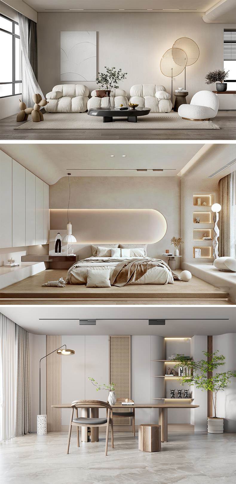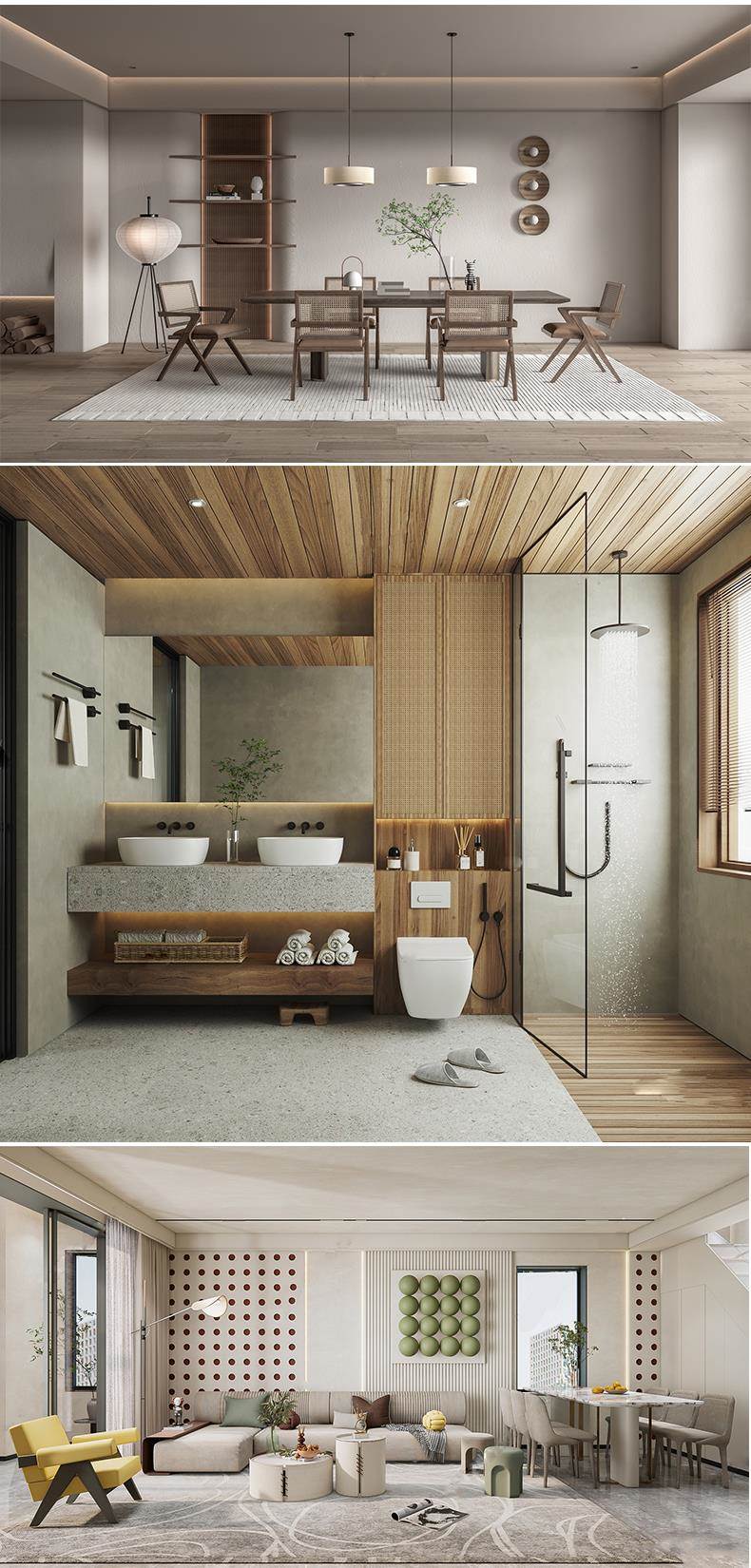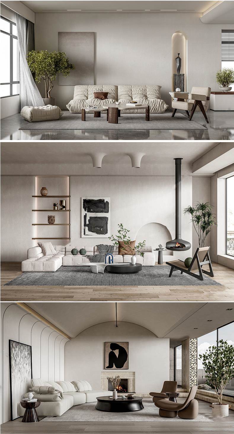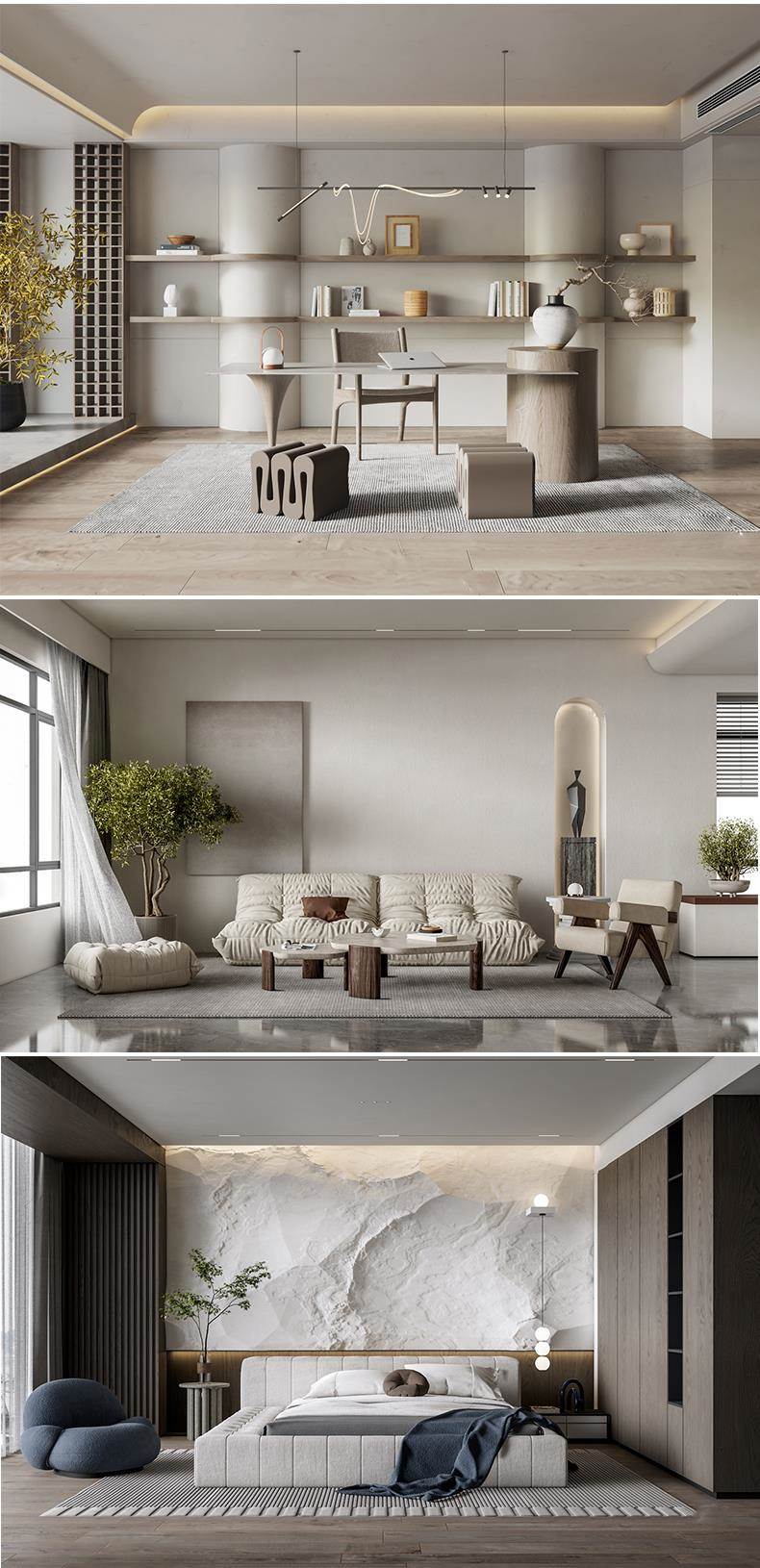 2024年侘寂风格草图大师现代极简家装室内设计客厅卧室SU模型素材[编号:A828]
